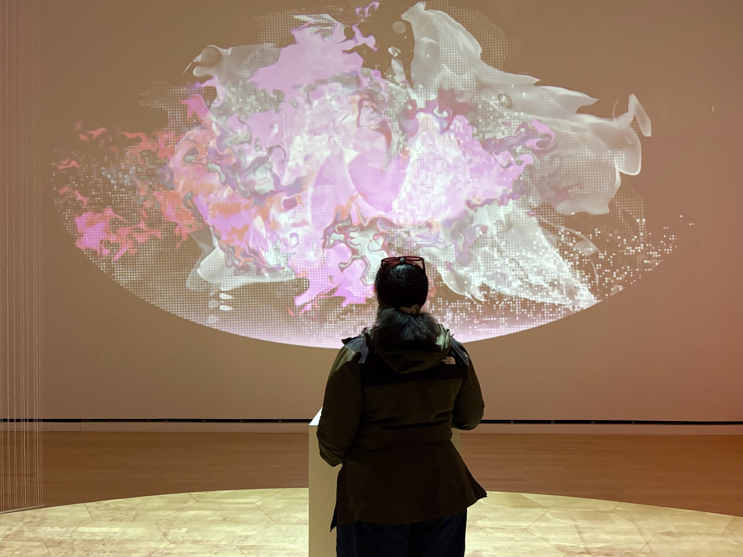 This interactive exhibit comes from Atlanta-based artist Bojana Ginn. A projection of organic shapes draws your attention immediately when you walk into the dark room. Pink and purple blobs slowly dance around each other. The shape and composition of this art piece are purely dictated by museum-goers. A small touch screen allows anyone to move the shapes from where they stand. Ginn is able to convey the relationship between humans and technology in a physical, direct and beautiful way.